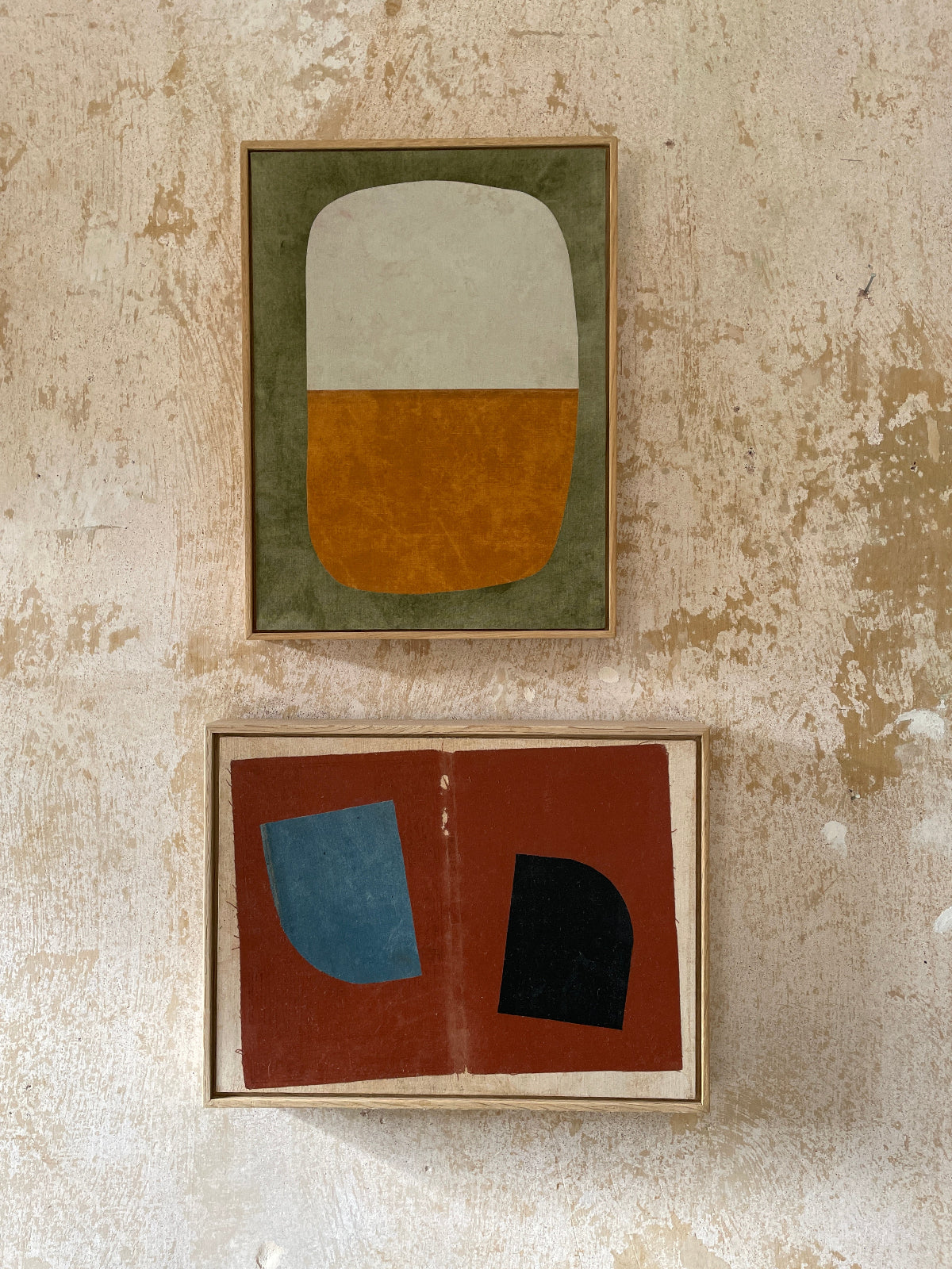Working with a limited palette, Katie spends hours arranging and rearranging the cloth to find balance, positive and negative space, and a sense of harmony. She will often experiment with mark making and removing colour, to add to the textural nature of the works.